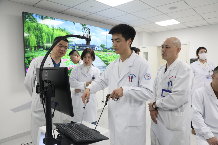 模拟训练室内,选手们分组上机操作、安静有序,只偶尔传来器械轻碰箱壁的细响。他们神情专注,仿佛面对的不是模拟箱,而是一台真实的手术。一名选手在缝合环节遇到线结滑脱,深吸一口气后重新夹针、绕线、打结,直到完成。整个过程中,没有人抬头张望,眼、脑、手高度协调,力求每一次操作都精准规范。