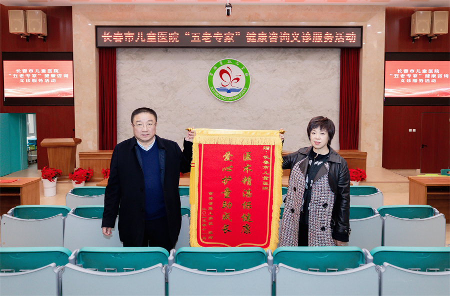 “在季节交替疾病多发之时,这么多儿科医生亲自上门,给孩子送来健康服务,真是雪中送炭。”张洁校长说,多年来,吉林省孤儿学校、长春市儿童医院始终保持着紧密的合作关系,医院不仅为孩子们开辟就医绿色通道,更在每一次就诊中给予孩子无微不至的关怀。为了表达深深的谢意,张洁校长特别送上一面心意满满的锦旗。“医术精湛保健康,爱心护童助成长”,这14个字不仅是感谢,更是对医者仁心的高度认可与真挚赞誉。