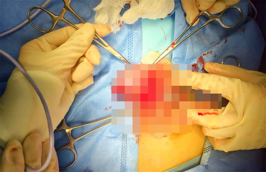 手术室内,麻醉、消毒、铺单……医护团队默契配合。当切开左侧睾丸鞘膜囊时,眼前的景象令人触目惊心,囊内积满鲜血,睾丸白膜及实质严重破裂,内部结构完全暴露,已有部分呈黑紫色。谢方达主任带领团队沉着应对——清理血块、精细止血、反复冲洗,小心翼翼将睾丸实质组织复位后,尽最大限度地缝合白膜,最终完整修复破裂的左侧睾丸。这场与时间赛跑的精细修复,全程仅用40分钟。